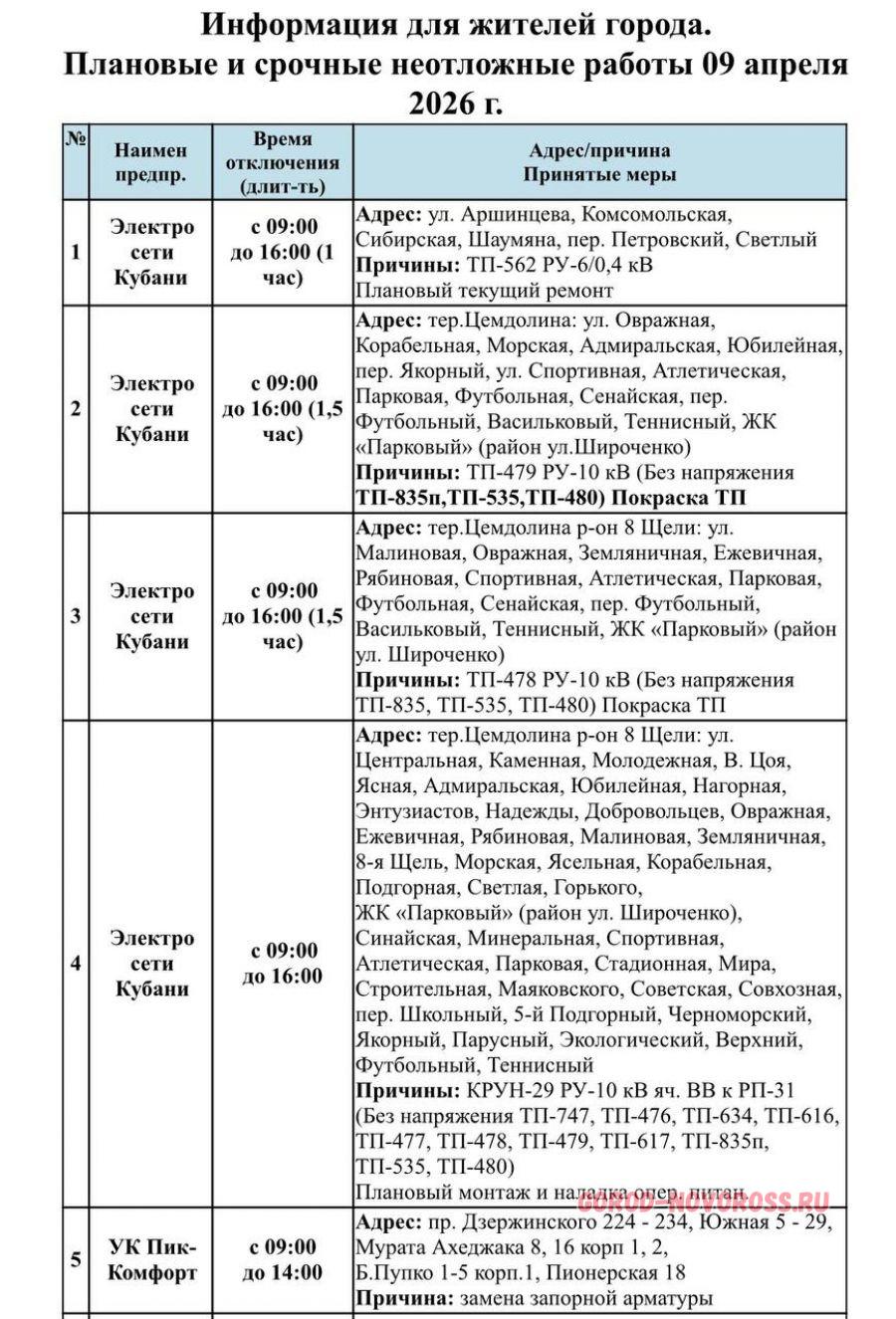 Информация о плановом и срочном отключении электроэнергии и газоснабжения в Новороссийске 09.04.2026 предоставлена МБУ «Безопасный город».